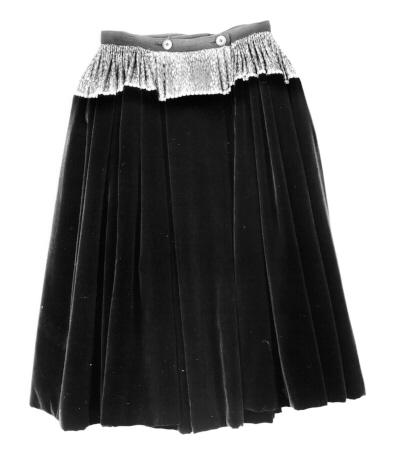 3-kertainen päällyshame. Mustaa paksua samettia, joka helmaosastaan kaksinkertaista. Musta keinokuituinen vuorikangas, jossa liitossauma 20 cm helmasta. Hame muodostuu viidestä samettikaistleesta, jotka pystysaumoin liitetty toisiinsa. Vyötäröllä 11 cm leveä hopeanhohtoinen, tiheästi poimutettu kangas, jonka alareunassa hopeanvärinen nastanauha. Nastojen halkaisija 0,9 cm. Vyötärökankaan poimutus tehty vetämällä kiristyslanka tiheiden vekkien läpi ja ompelemalla vekkien päät käsin kiinni vyötärönauhaan. Vyötärönauha vahvaa mustaa kangasta, leveys 3,5 cm. Vyötärökankaan vekit jäävät näkyviin myös hameen sisäpuolelle. Hameen edessä poimuttamaton osa, jossa halkio. Halkion molemmilla puolilla kolme laskosta, syvyys 7-8 cm. Halkio suljetaan vastalaskoksella, jota kiinnittää kaksi suurikokoista nappia, halkaisija 2,4 cm.