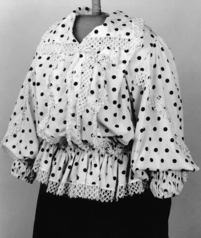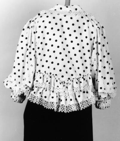 Valkopohjaista, mustapalloista tekokuitukangasta. Valkoinen 4 cm leveä, verkkomainen pitsi reunustaa kaulusta, helmaa ja etuhalkiota sekä etumuksen siksak-mallista lievettä. Takana vyötäröllä on V-muotoisen helmakiinnityksen yläpuolella samaan muotoon kiinitetty pitsireunainen röyhelö. Lisäksi hihoissa on päälleommeltuna V-muotoiset pitsinauhat. Helma muodostuu kahdesta 13 cm leveästä suorakaiteen muotoisesta kaitaleesta. Liitossauma takana. Helman kiinnitys takaa V-mallinen. Helmakaitale on yläreunastaan siksakaten kapeasti päärmätty ja 2,5 cm välein poimuompeleella kiinnitetty siten, että poimutusreuna jää röyhelöksi päälle. Poimuompeleiden väliin jäävään kujaan on etumuksessa pujotettu kuminauha. Helman alareunassa pitsi. Hihat ovat pitkät ja väljät, olalta poimutetut. Suun päärmeeseen on pujotettu kuminauha. Kumilankaompeleita on 3,5 cm - 4 cm välein aina 2 rinnakkain siten, että muodostuu joustava 14 cm pitkä ranneke. Hihojen päälle on ommeltu pitsinauhaa siten, että hihansivuilta molemmin puolin alkavat nauhat yhtyvät hihan päällä muodostaen V-muodon. Röijyn etuhalkio on painonapein kiinnitettävä. Etumuksen molemmin puolin ylhäällä 18 cm pitkät pystylaskokset, jotka kiinnittyvät olkasauman puoliväliin. Lisäksi etumuksessa on etuhalkion molemmin puolin olkasaumasta helman kiinnitykseen ulottuvat siksak-malliset, pitsireunaiset liepeet.