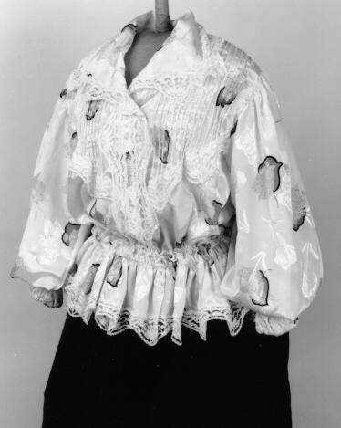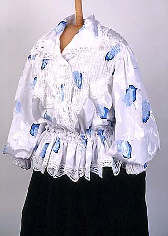 Valkopohjaista tekokuitukangasta, jossa kiiltäviä kukkakuvioita sekä mustareunuksisia sinisen eri sävyillä tehtyjä tyyliteltyjä kukka-aiheita. Valkoinen, enimmillään 6 cm leveä aaltoreunainen pitsi reunustaa kaulusta, helmaa ja etuhalkiota. Takana vyötäröllä on V-muotoisen helmakiinnityksen yläpuolella samaan muotoon kiinnitetty pitsireunainen röyhelö. Röijyn etumuksessa on lisäksi pitsikaarrokkeet. Helma muodostuu kolmesta 12 cm leveästä suorakaiteen muotoisesta kaitaleesta. Liitossaumat sivuilla. Helman kiinnitys takaa V-mallinen. Helmakaitale on yläreunastaan siksakaten kapeasti päärmätty ja 2 cm välein poimuompeleella kiinnitetty siten, että poimutusreuna jää röyhelöksi päälle. Poimuompeleiden väliin jäävään kujaan on etumuksessa pujotettu kuminauha. Helman alareunassa pitsi. Hihat ovat pitkät ja väljät, olalta poimutetut. Suun päärmeeseen on pujotettu kuminauha. Kumilankaompeleita on 2,5 cm välein siten, että syntyy joustava 13 cm pitkä ranneke. Röijyn etuhalkio on painonapein kiinnitettävä. Etumuksen yläosa on 1 cm välein hiuslaskostettu. Laskostetun osan alareunassa pitsikaarroke.