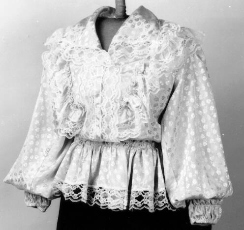 Aprikoosinväristä, kiiltävää, pinnaltaan hieman ryppyistä keinokuitukangasta, jossa kiiltäviä pieniä kukkakuvioita. Valkoinen 5 cm leveä pitsi reunustaa kaulusta, helmaa ja etuhalkiota sekä olalta V-muotoisesti eteen kiinnitetyn 5 cm leveän röyhelön reunaa. Takana vyötäröllä on V-muotoisen helmakiinnityksen yläpuolella samaan muotoon kiinnitetty pitsireunainen röyhelö. Helma muodostuu kahdesta 15 cm levestä suorakaiteen mallisesta kaitaleesta, liitossauma takana. Helman kiinnitys takaa V-mallinen. Helmakaitale on yläreunastaan siksakaten kapeasti päärmätty ja 2 cm välein poimuompeleella kiinnitetty siten, että poimutusreuna jää röyhelöksi päälle. Poimuompeleiden väliin jäävään kujaan on etumuksessa pujotettu kuminauha. Helman alareunassa pitsi. Hihat ovat pitkät ja väljät, olalta poimutetut. Suun päärmeessä on pujotettu kuminauha. Kumilankaompeleita on 3 cm välein aina 2 rinnakkain siten, että muodostuu 15 cm pitkä joustava ranneke. Röijyn etuhalkio on painonapein kiinnitettävä. Olalta eteen kaartuvat pitsireunusteiset röyhelöt yhdistyvät n. 15 cm helman kiinnitysreunan yläpuolella.