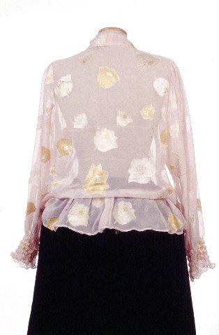 Vaaleanpunaista ohutta sifonkia. Kankaassa on suuria, kullankeltaisia kirjottuja kukkia. Etuhalkio kiinnitetty neljällä nepparilla. Hihat poimutettu kuudella päällekkäin olevalla kumilangalla, joiden avulla muodostettu joustava ranneke. Alhaalta kapeasti päärmätty helma on tehty kolmesta kaitaleesta. Väljät hihat rypytetty olkapäiltä.