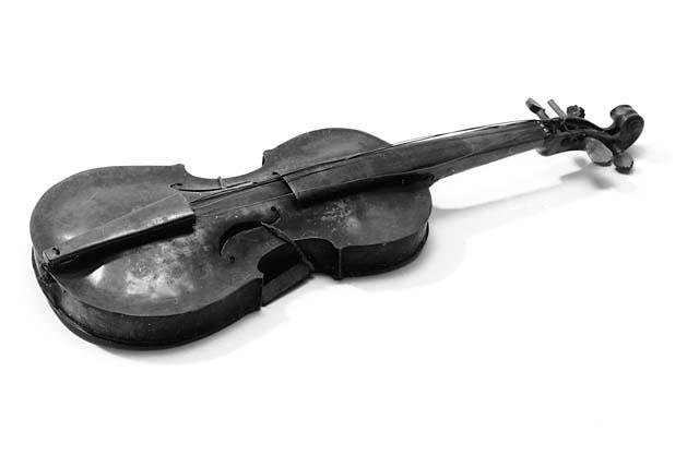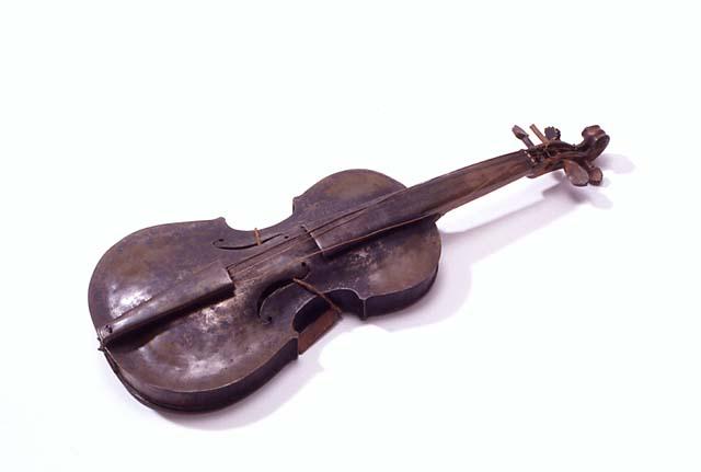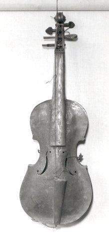 Messinkipeltinen viulu. Tappirasia, yläsatula ja mahdollisesti osa välikaulaa ovat puuta. Otelauta messinkiä, kielenpidin messingillä päällystettyä puuta. Viritystapit tallella, mutta kaikki neljä erilaisia. Kaikki kielet tallella; kaksi alinta suolikieliä, joista ainakin toinen solmittu paljaiden suolikielten jäänteisiin tappirasiassa. Soittimen f-aukkojen läpi kulkee soittimen ympärillä naru, jossa on kiinni puinen, neliskulmainen äänipinna, jonka kulmat ovat pyöristetyt.