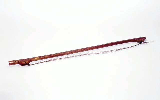 Jouhikon jousi. Puinen tanko on suora ja pyöreäksi veistetty. Jousen kärjessä ja kannassa on pyolipyöreät ulkonemat, joissa oleviin reikiin jouhet on solmittu.