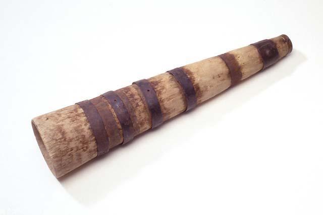Puutrumpetti. Suora, kartiomaisesti levenevä torvi, jossa rungon ympärillä on ollut kuusi rautarengasta, näistä viisi on jäljellä. Kaulussuukappaleen päässä on puhaltamista helpottava messinkihattu. Soittimen puurungon poraus on kolmivaiheinen.