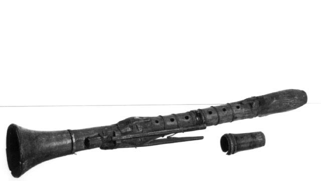 Kokopuinen klarinetti, jossa sormiaukkoja 7+1, läppiä 5. Soitin koostuu kolmesta osasta. Suukappale puuttuu, mutta suukappaleen suojus on jäljellä osin rikkoutuneena. Soittimen liitoskohdissa päärynän ja rungon välillä sekä keskiliitoksessa sarviset renkaat, alimmassa kaikusuppilon liitoksessa rengas on metallinen. Sormiaukkojen ympärillä erottuvat erilliset puukappaleet, joihin kaikki sormiaukot alimmaista lukuunottamatta on porattu. Lisäpaloja on kaikkiaan kolme: yksi peukaloaukon kohdalla, yksi vasemman käden sormiaukkojen kohdalla ja kolmas oikean käden sormiaukkojen kohdalla. Reiät on mahdollisesti porattu erillisiin puuosiin virityksen tarkistamiseksi. Kaikki kiinnitykset tehty pienin metallikoukuin. Lisäksi soittimen runkoa kiertävät rautalankavanteet.