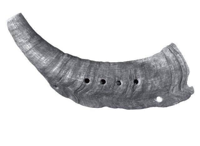 Pukin sarvesta tehty soitin, jossa neljä sormiaukkoa ja sivussa kaksi ripustusreikää.