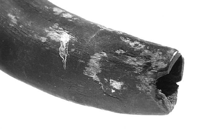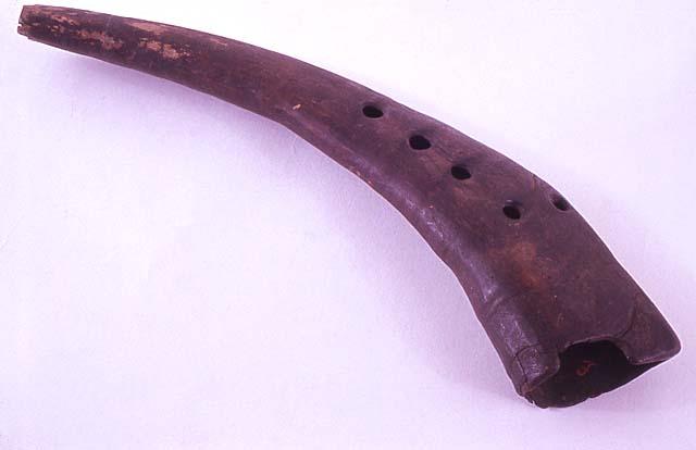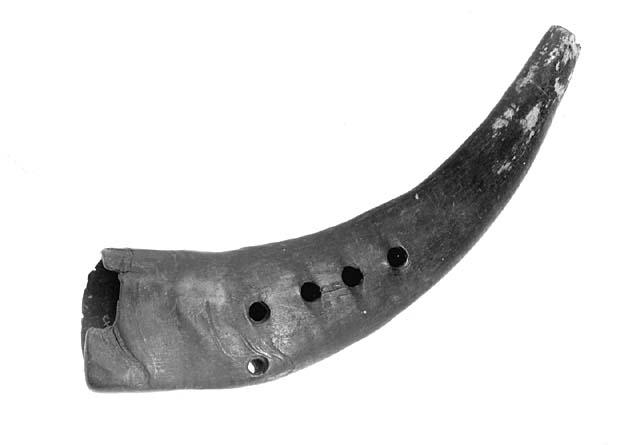 Pukin sarvesta tehty soitin, jossa neljä sormiaukkoa ja sivussa ripustusreikä.