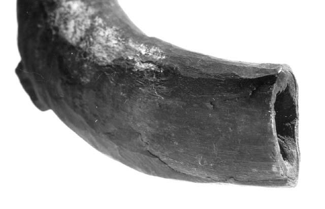 Pukin sarvesta tehty soitin, jossa kaksi sormiaukkoa ja sivussa ripustusreikä. Vaikuttaa keskentekoiselta.
