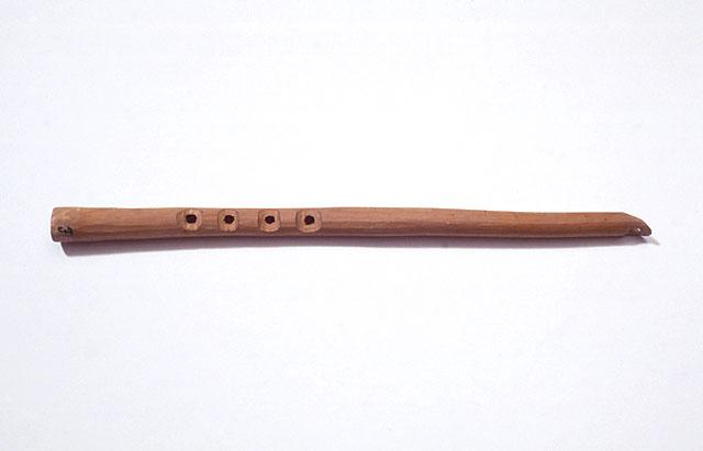 Mäntyinen siirtotulppahuilu, jossa neljä sormiaukkoa. Museoon tullessaan huilun on sanottu olleen uuden, mutta hyvin vanhaa mallia.