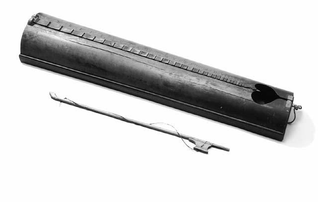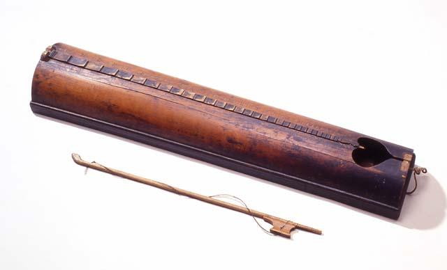 | huomiot | Osan mitat: pituus 61.00 cm; paino 44.00 g; pituus 92.00 cm; leveys, suurin 20.50 cm; leveys, pienin 17.50 cm; korkeus 13.50 cm; Merkinnän kuvaus: kaivertamalla tehdyt kirjaimet, jotka osoittavat sävelasteikkoa; Merkintätekniikka: kaiverrus; Osa: jousi; pykälälauta |