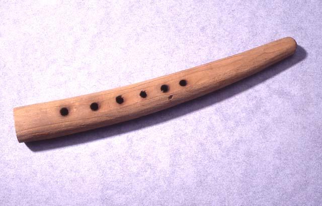 Käyrä, puusta tehty sarven mallinen soitin, joka on jäänyt keskentekoiseksi. Poraus todennäköisesti tehty ensin poralla, minkä jälkeen sitä on laajennettu ainakin poltinraudalla. Sormiaukkoja on 6.