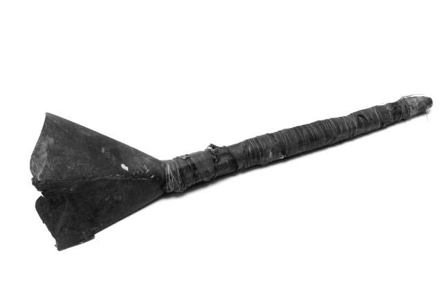 Suurikokoinen puhallinsoitin, joka on tehty rautapellistä. Alaspäin hieman levenevä putki on liitetty kulmikkaaseen, laajaan kaikusuppiloon. Putki on kauttaaltaan päällystetty kangassuikaleilla, joiden ympäri on kiedottu pellavalankaa. Puhalluspää litistetty.