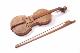Kotitekoinen viulu jousineen. Vaaleaa puuta. Talla koristeellinen. Kielistä kolme on suolikieliä, neljäs kieli metallinen. Jousi vaaleaa puuta, frossissa rautalankakiinnitys. Jouhet vaaleat.