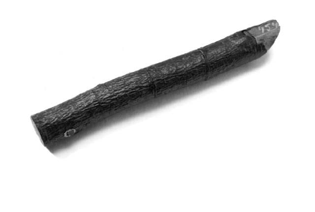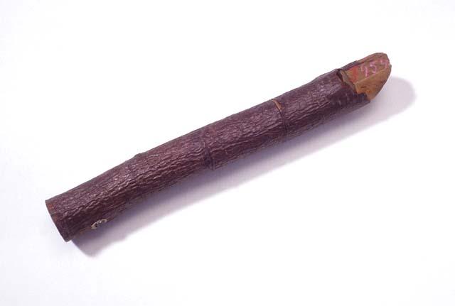 Pienikokoinen lepästä tehty sormiaukoton huilu, joka on tehty tavallisen pajupillin tavoin. Huilun kuoresta on lohjennut palanen.