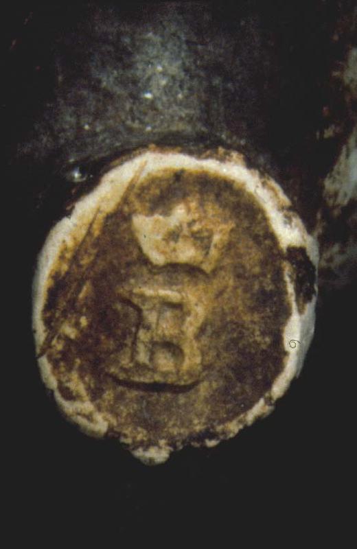 | huomiot | Tuotemerkintä: Goudan piippujen tuotemerkki kohokuviona; Osan mitat: korkeus, suurin 0.40 cm; halkaisija, suurin 2.40 cm; korkeus 5.00 cm; pituus 32.50 cm; halkaisija, suurin 0.90 cm; Kirjallisuus: Don Duco, Merken van Goudse pijpenmakers 1660-1940. Uitgeversmaatschappij De Tijdsroom B.V. Lochem 1982.; Don Duco, De Nederlandse kleijpijp. Handboek voor dateren en dermineren. Stichting Pijpenkabinet. Leiden 1987.; Jan Van der Meulen, De "gecroonde roos" en andere pijpenmakersmerken van Gouda. Pijpelogische Kring Nederland. Leiden 1994.; Merkintätekniikka: leimaus; Osa: jalkanipukka; piipun kopan suu; piipun koppa; varsi; Leima: Kantaleima; Valmistajamerkintä; Koristelu: Kopan suun alapuolta kiertää pistenauha.; Kontekstiaika: 8.10.1771; Aineistotyyppi: esine; Merkinnän kuvaus: B, jonka yläpuolella kolmisakarainen kruunu.; Vaakunakilpi, jonka yksityiskohdat erottuvat erittäin heikosti. Kyseessä on Goudan vaakuna, keskipalkki, jonka sivuilla kolme tähteä.; Vartta kiertää 3 sahanteräkuvioista nauhaa, jonka yläpuolella (kopan pää) erottuvat kirjaimet ERW? ? E Nauhojen toisella puolella erottuu kirjaimet UD (=GOUDA) |