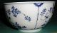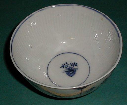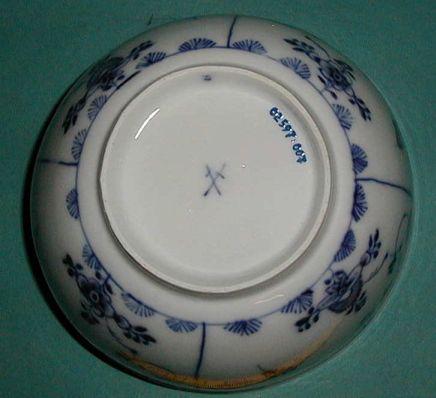 Meissenin Gebrochener Stab -reliefillä koristettu posliinikulho. Pohjaansa kohti kaartuva, jalkarenkaallinen kulho. Koristeaihe Strohblumenmuster. Koristelu jakaantuu neljälle kentälle siten, että vastakkaiset kentät ovat keskenään samanlaiset. Astian sisäseinämää kiertää 1,5 - 2 mm etäisyydellä suuaukon reunasta sininen koristeviiva. Astian sisäpohjassa sinimaalattu koristeympyrä (halk. 68 mm), jonka keskellä apilamainen kukkamaalaus. Koristeen keskellä valmistusvirhe (halkeama). Ei nostosta aiheutuneita vaurioita.
