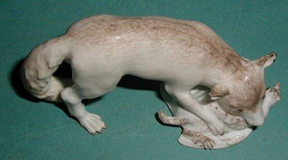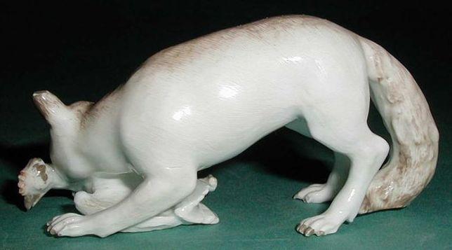 Meissenin posliinia oleva jalustallinen pienoispatsas, kettu ja kukko. Matalana kulkeva kettu, jonka pää sekä kaula- ja selkälinja ovat samalla korkeudella. Ketun häntä ylettyy maahan. Kettu vetää suussaan kukkoa pitkin maata. Jalusta on ketun etujalkojen ja rungon alla. Pohjaosia lukuun ottamatta lasitettu. Lasituksen päälle maalattu ketun selkäosa ja häntä sekä kukon selkämys ja nokka ruskehtaviksi. Myös ketun korvat ovat hailakan ruskeat ja samoin vasemmassa kyynärpäässä on ruskeaa. Ketun silmät ovat ruskeat. Posliinimassa valkoista. Maalauskoristelun värit ovat ruskean eri sävyjä. Samanlainen kuin SMM698:6.