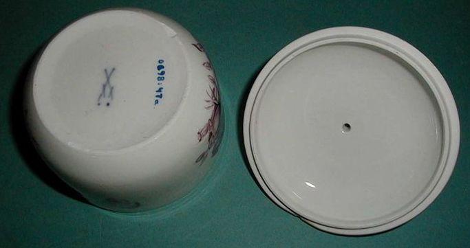 | huomiot | Osan tekniikka: keramiikka; Osan materiaali: keramiikka; Osan mitat: halkaisija 90.00 mm; korkeus 61.00 mm; halkaisija 98.00 mm; korkeus 45.00 mm; Osan Pintamateriaali / käsittely: lasitus; Tyyli: rokokoo; Merkintätekniikka: leimaus; Malli: Deutsche Blumen; Osa: a: sokerikko; b: kansi; Leima: Meissenin tehdasleima; Kontekstiaika: 1747; Merkinnän kuvaus: sininen miekkaleima, jonka sakarapään alapuolella on kaksi sinistä pistettä, pisteiden etäisyys toisistaan noin 5 mm; Aineistotyyppi: esine; Tapahtuma: Kolmimastokaljuutti St. Mikael upposi syksyllä 1747 Nauvon Borstön lähellä matkallaan Amsterdamista Pietariin. Hyvin säilynyt hylky löytyi 1950-luvulla. |