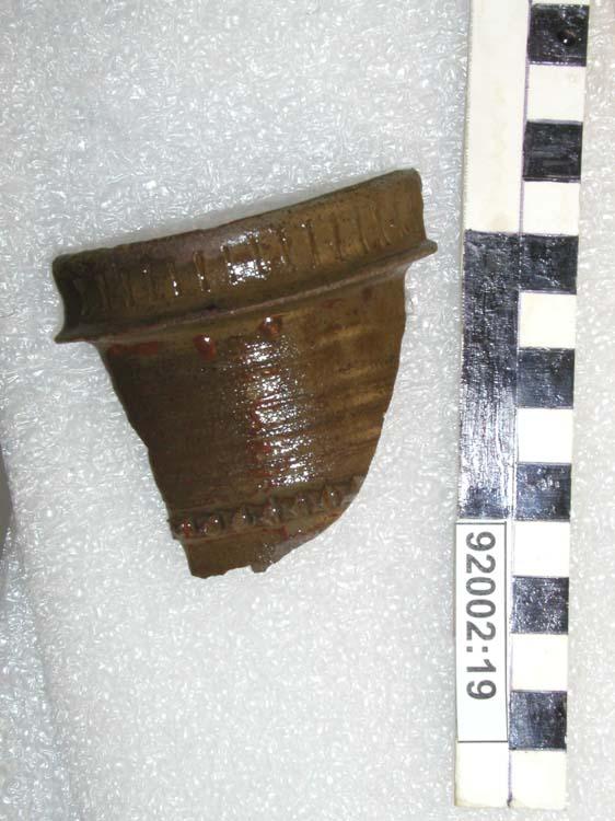 | huomiot | Osan tekniikka: keramiikka; Osan materiaali: keramiikka; Osan mitat: halkaisija, suurin 7.35 cm; Kirjallisuus: Claes Wahlöö: Keramik 1000-1600 i svenska fynd, Archaeologica Lundensia, kulturhistoriska museet, Lund, 1976; -D. Gaimster: German Stoneware 1200-1900, archaeology and Cultural History, Cambridge University Press, 1997 -ed. D. Gaimster, M. Redknap: Everyday and exotic pottery from Europe c. 650-1900 : studies in honour of John G. Hurst, Oxford, 1992 -ed. D. Gaimster, M. Redknap, H-H. Wegner: Zur Keramik des Mittelalters und der beginnenden Neuzeit im Rheinland, Oxford, 1988; David Gaimster, Hanseatic Trade and Cultural Exchange in the Baltic cirka 1200-1600. Pottery from Wrecks and Harbours. Teoksessa Schutz des Kulturerbes unter Wasser. Lübstorf 2000.; Osa: suureuna; Koristelu: Suureunan ulkopuoli on koristeltu pykäläviivaleimoilla ja reunan alla on sileä teräväreunainen kohovyö. Vartalo on koristeltu kohovöillä (4 kpl), joissa on myös rullaleimapainanteet. Pykäläviiva-leimakoristelu kiertää myös vartalon ympäri kohovöiden välissä.; Kontekstiaika: 1300-luku, keskiaika; Aineistotyyppi: esine |