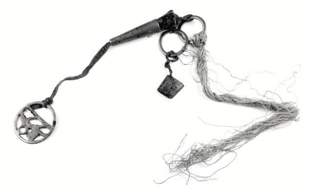 Vyölliset, joihin kuuluu neulakotelo sekä kaksi rengasta, joista toisesta riippuu kimppu suoninyöriä, nahkainen sormikota sekä vyöllispyörä, jonka keskustassa on leijona-aihe.