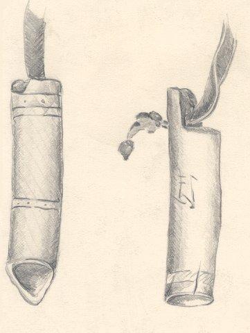 Nahkahihnaan (ruktatshuarvibeaddi) on koottu metsästäjän välineitä: Ruutisarvi (ruktatshuarvi), joka on piirtämällä koristeltu. Rohdinpussi (nyövvipurssa) on pahkainen ja siinä on rohtimia, paperia sekä luoteja. Luotikukkaro (luodapurssa) on nahkaa ja siinä on luiset leuat sekä puutulppa. Siinä pidetään hauleja. Nahkainen haulikukkaro (haulapurssa) hauleineen, tulppana on luinen haulimitta. Ruutimitta (muahta) on luusta ja hieman koristeltu. Kokonaisuuteen kuuluu lisäksi toinen luinen ruutimitta.