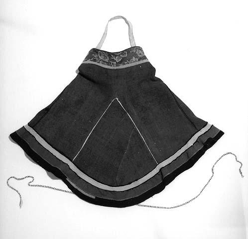 | huomiot | Osan tekniikka: käsityö/tekstiili; Osan materiaali: kangas; Osan mitat: korkeus 46.00 cm; ympärysmitta 106.00 cm; ympärysmitta 62.00 cm; korkeus 63.00 cm; Osa: etuosan keskikohta; helma; pääntie; takaosan keskikohta |