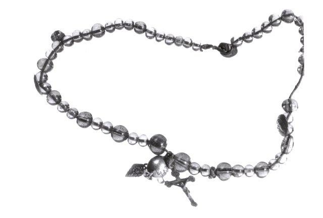 Helminauha merivahasta (meripihka) ja tummansinisestä lasista. Alapäässä helmillä varustettu kullattu hopeapallo ja krusifiksi; kummallakin sivulla vaskinappi, jossa kuvattu sotatapparan koukistetun varren päällä seisova jalopeura. Suljettava niskasta vaskinapilla.