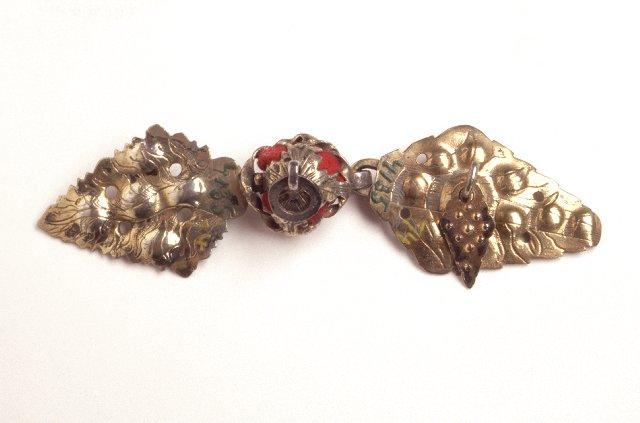 Hakassolki kullattua hopeaa. Pyöreän keskiosan alla on punaista verkaa, keskellä riippuva rengas. Toisen päätelevyn keskellä on riippuva hely.