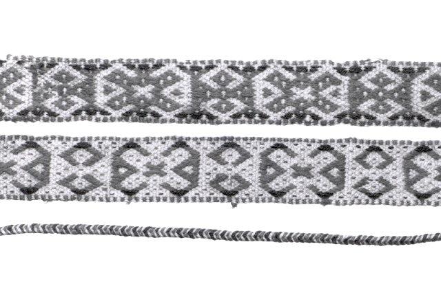 Kengänpaulat, kude ja loimi villaa, päät letitetty, päissä tupsut. Värit: luonnonvalkoinen, punainen ja sininen.