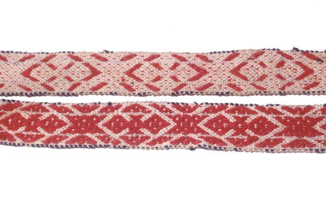 Nauhapirralla kudotut paulat, kahdella värillä kudotut: punaisella ja sinisellä. Loimi pellavaa.