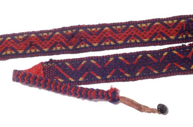 Kengänpaulat, villaiset, nauhapirralla kudottu. Väreinä tummansininen, punainen ja keltainen. Paulan päät on vahvistettu kangaspaloilla ja nyörien päät palmikoitu. Nyörin päässä on nahkavahvistus sekä lasinen kiinnitin. Paula on paikoitellen kulunut puhki.