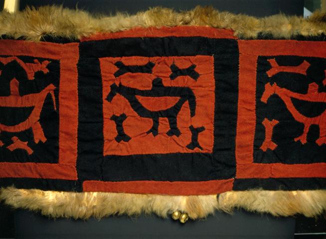 Peite on suorakaiteen muotoinen ja ommeltu punaisesta ja mustasta verkakankaasta mosaiikkitekniikalla. Se on koristettu hevosen kuvilla. Joka toinen hevonen on punainen mustalla taustalla ja joka toinen musta punaisella taustalla. Satula on reunustettu poronnahalla. Kulmiin ja pitkien sivujen keskelle on kiinnitetty kulkusia.