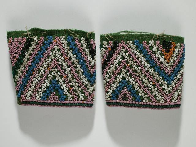 Hihansuut ovat vihreästä sarkakankaasta. Niihin on ommeltu sinipunaisilla, vihreillä, valkoisilla, keltaisilla ja sinisillä lasihelmillä sisäkkäisiä kolmioita. Kuvio: WotHump 'tuuliaalto'.