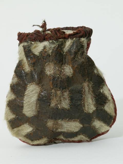 Tuluskukkaro on valmistettu mosaiikkitekniikalla. Pussin suuhun on pujotettu nahkainen kiristysnauha. Sivukappaleet ovat punaista verkakangasta. Etu- ja takakappaleet on tehty valkoisesta poronvuodasta ja ostonahkasta. Kuvio: norma 'lavitsa'.