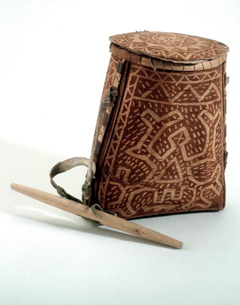 Tuohikontin pienoismalli. Kontti on tehty tuohilevystä ompelemalla sivut yhteen. Kontin suuhun sekä ulko- että sisäpuolelle on ompelemalla kiinnitetty tueksi puuvanne. Kansi on pyöreä, ja se on kiinnitetty konttiin nahkanauhalla. Kontissa on nahkaiset kantohihnat, jotka on pujotettu poikittain olevan puisen kepin läpi. Kepillä on tasattu kontin painoa. Tuohikontti ja sen kansi on kokonaan kuvioitu raaputtamalla tehdyillä ornamenttikuvioilla. Kannessa HotallakW 'päivän kehä', etupuolella HoltneHum 'koldanilla kalastava mies', takapuolella Wortolnoika 'karhu'. pohjassa oHsarkoniloW 'ketun kyynärpää' ja sivuilla pakpal 'kävyn puolikas'.
