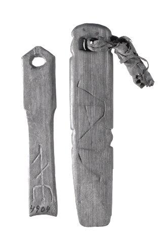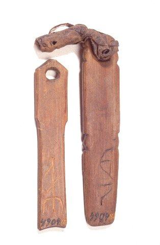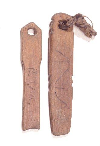 Omistajan nimikirjaimilla varustettuja puisia kilkuloita. Toisella puolella on omaperäinen puumerkki.