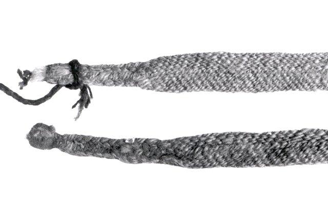 Langasta kudotut naisen kengänpaulat. Langan päät palmikoitu.