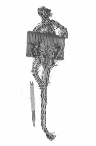 Panoksella oleva tiuhta. Litteä lauta, jossa on samansuuntaisia pystysuoria rakoja ja niiden välissä samalla korkeudella rivi reikiä. Sillä on valmistettu luusta valmistetun kävyn avulla villalangasta kengänpauloja ja vöitä.