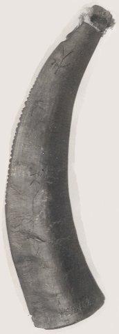 Lehmänsarvesta tehty ruutisarvi, joka on koristettu piirroksilla, joista eräät muistuttavat noitarummun kuvioita; ovat puumerkkejä.