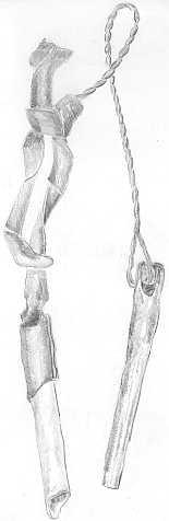 | huomiot | Osan tekniikka: punostyö; Osan mitat: pituus 20.00 cm; pituus 9.50 cm; halkaisija, suurin 0.80 cm; halkaisija, pienin 0.60 cm; halkaisija 0.60 cm; Osan materiaali: luonnonkuitu; luu; Osa: hihna; puikko; reikä |
