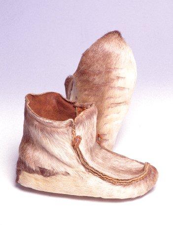 Matalavartiset, ruskean ja valkoisen kirjavaa hirven koipiturkista. Pohja ommeltu yhdestä kappaleesta, joka päättyy takana kantalappuun. Pohjan karvapeitteeseen on tehty loveuksia, joiden tarkoituksena lienee ollut lisätä pitoa. Pohjakappaleen yläpuolella on jalkineen molemmin puolin kapeat partaat ja niiden yläpuolella yhdestä kappaleesta koostuva ruojus. Jalkineen suulla on noin 1 cm:n levyinen alue, jolta karvat on leikattu pois. Iltin saumoissa nahkaraksit pauloja varten.
