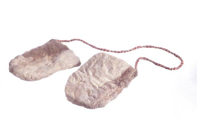 Valmistettu vaalean vasannahan jäännöspaloista. Peukalottomat kintaat on ommeltu periaatteessa kahdesta samanlaisesta kappaleesta, jotka on koottu yhdestä tai kahdesta nahanpalasta. Kintaat on yhdistetty toisiinsa 51 cm pitkällä punaisesta ja valkoisesta villalangasta palmikoidulla nyörillä.