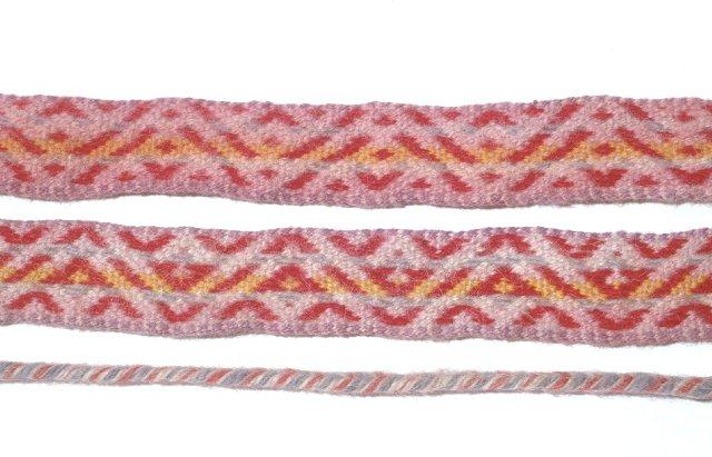 Naisen paulat, villaa, kudottu nauhapirralla. Kangasvahvikkeet paulan päissä, sekä nauhojen päät letitetyt, sekä niissä tupsut. Värit: keltainen, punainen, vaaleanpunainen, violetti ja harmaa.