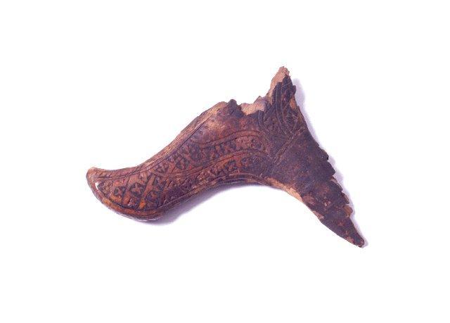 Noitarummun eli kannuksen vasaran juovilla ja risteillä koristetut leikkaukset on täytetty pihkamaisella aineella; esineestä suurin osa on vartta ja toinen sakara murtunut pois.