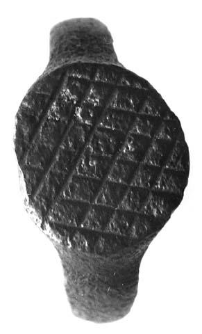 Soikeakilpinen pronssisormus. Koristettu vinoruudukolla.