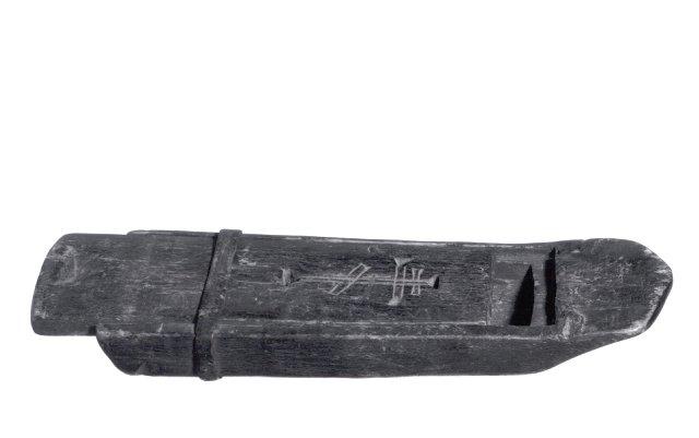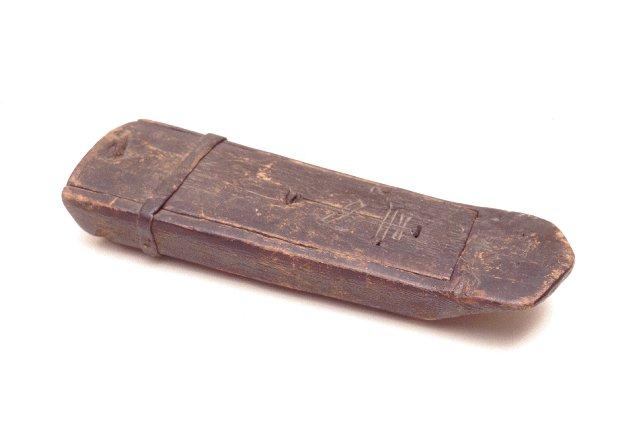 Yhdestä puusta koverrettu, työntökannella varustettu rasia. Tasapohjainen, laidoiltaan pyöristetty pohja suippenee jyrkästi rasian toista päätä kohti. Päältä katsottuna rasia myös kapenee tätä päätä kohti. Kansi asettuu samaan tasoon pinnan kanssa ja sitä pitää paikoillaan rasian leveän pään yli kulkeva nahkasuikale. Kansi litteä ja lievästi kupera, sen leveään päähän on tehty kolmion mallinen lovi avaamisen helpottamiseksi. Kansi koristeltu kreikkalaiskatolisella ristinmerkillä. Rasia kauttaaltaa mustaksi käsitelty .