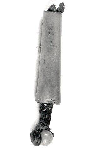 Neulaputki, jossa nahkakannin, sen päässä kaksi erilaista helmeä.