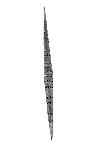 Värttinä "nalddi", kolmiosyvennysleikkauksin sirosti koristettu, punaiseksi värjätty.