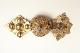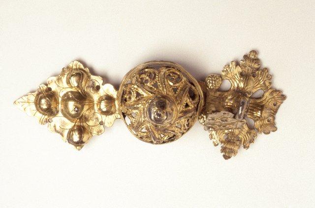 Kaksiosainen kullattu hopeasolki. Runsaasti läpikoristeltua korkeaa keskustaa ympäröi sen molemmin puolin rombimaiset lehdykät. Lehdykköjen keskustaan on kiinnitetty lisäksi irtonaiset, riippuvat lehdykät (toinen puuttuu). Ei leimoja.