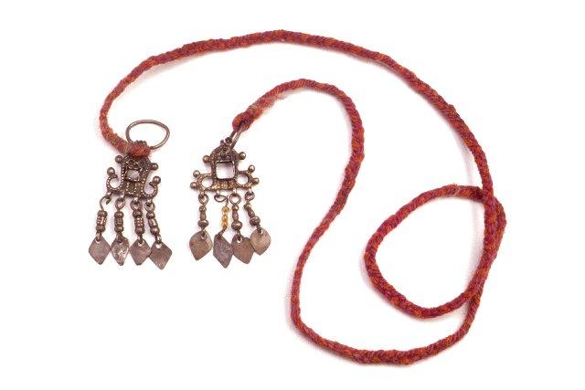 Kiinnitetyt n. 70 cm pituisen palmikoidun sinipunervan ja oranssin kirjavan villanauhan päihin.
